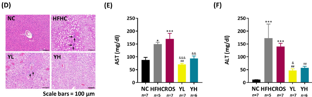 조직 염색(H&E staining)을 통해 지방간의 형태학적 변화를 살펴보았습니다. HFHC군에서 유도된 간 손상 대비 이진탕 투여군에서의 지방(흰 반점)이 현저히 감소된 것을 확인할 수 있습니다. 혈액검사 결과, 흔히 '간 수치'라 불리는 AST와 ALT에도 차이가 있었습니다. NC군 대비 HFHC군에서 확연히 높은 수치를 보인 반면 이진탕 투여군(YL, YH)은 현저히 낮은 수치를 보인 것입니다.