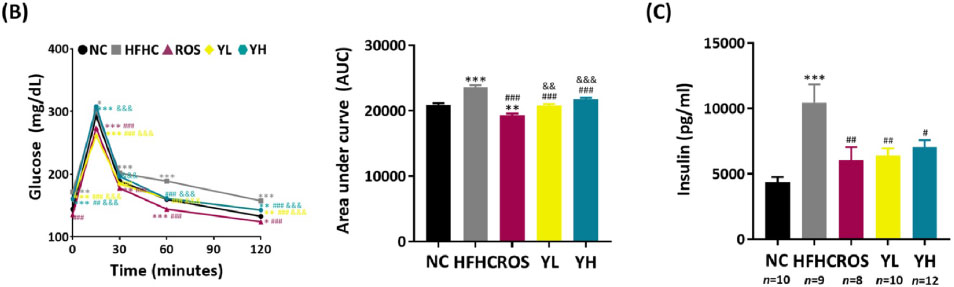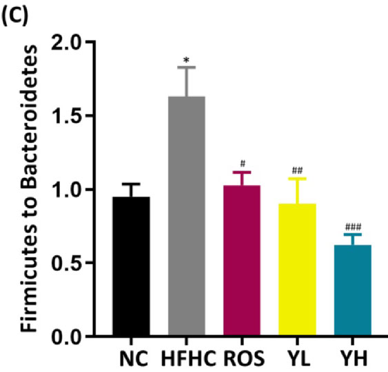 실험에 사용된 쥐는 6주령 C57BL/6J로, 총 54마리의 쥐가 일반식이(NC)군(11), 고지방식이(HFHC)-운동대조군(10), 고지방식이-ROS대조군(9), 고지방식이-저용량(50mg/kg/day)이진탕(YL)(12), 고지방식이-고용량(100mg/kg/day)이진탕(YH)(12)의 5개 군으로 나뉘었습니다. 그리고 이후 일반식이-고용량이진탕군(8)이 추가되었습니다. 이후 채취된 간 조직과 장 조직에서는 각각 지질 분석 및 장내 미생물균 분석이 이루어졌습니다.