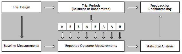 단일 피험자를 대상으로 A와 B라는 두 가지 약물을 투여하는 경우 A의 결과와 B의 결과가 혼재(Carryover effect)되어 나타날 가능성이 존재하고, 이는 인과 관계 파악에 치명적인 문제가 될 수 있습니다. 따라서 N-of-1 Trial에서는 한 중재를 적용한 후 충분한 Wash-out(효과세척기간)을 두고, 각 중재의 순서 또한 무작위로 섞어 각 세션별 결과를 따로 살펴보는 과정을 통해 각 중재와 임상 경과와의 인과성을 엄격하게 평가합니다. 즉, N-of-1 설계는 교차시험 디자인(Crossover Design)의 일종인 것입니다.