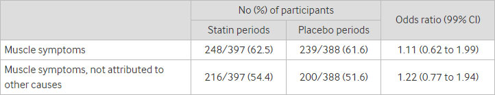 Herrett E, Williamson E, Brack K, Beaumont D, Perkins A, Thayne A, Shakur-Still H, Roberts I, Prowse D, Goldacre B, van Staa T, MacDonald TM, Armitage J, Wimborne J, Melrose P, Singh J, Brooks L, Moore M, Hoffman M, Smeeth L; StatinWISE Trial Group. Statin treatment and muscle symptoms: series of randomised, placebo controlled n-of-1 trials. BMJ. 2021 Feb 24;372:n135. doi: 10.1136/bmj.n135. PMID: 33627334.
