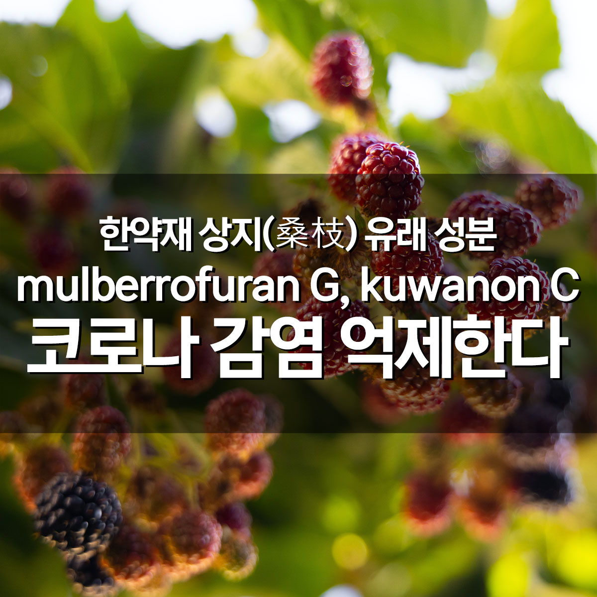 한국한의학연구원(이하 한의학연) 한의기술응용센터 최장기 박사 연구팀(제1저자 김영수 박사)은 한약재 상지(桑枝, 뽕나무 어린 가지)로부터 코로나바이러스(SARS-CoV-2)의 감염을 효과적으로 억제하는 효능 물질을 발굴했다. 본 연구성과는 국제전문학술지인 뉴트리언츠(Nutrients, IF 6.706) 및 분자과학 국제저널(International Journal of Molecular Sciences, IF 6.208)에 각각 게재되었다.