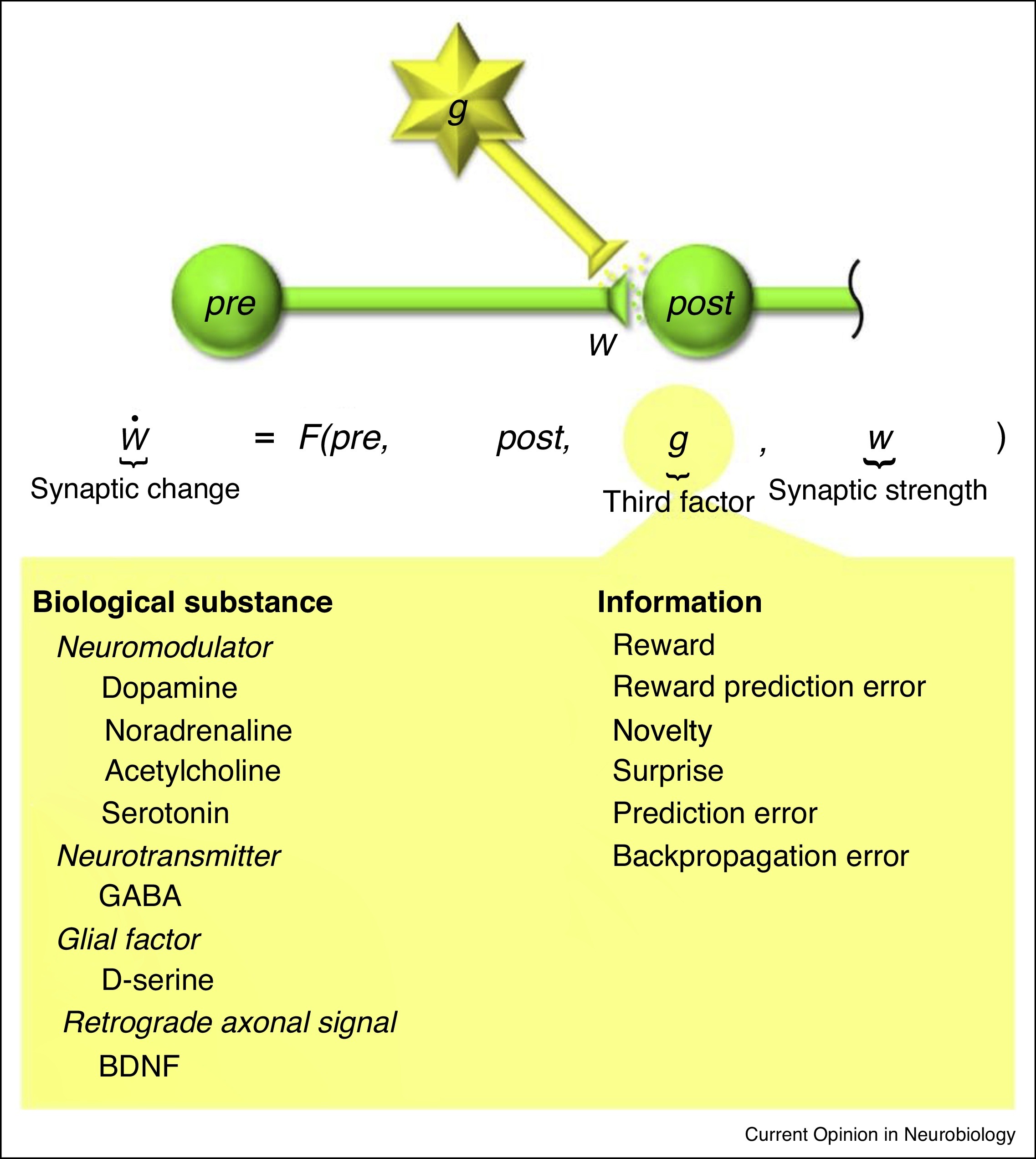 즉, 뉴런의 출력이 클 때 뉴런의 입력들 중에서 하나가 크다면 그 두 뉴런 사이의 연결 강도 역시 강해진다는 것이다. 곧, 두 뉴런이 서로 반복적·지속적인 점화(firing)를 일으켜 한쪽 또는 양쪽 모두에 변화를 야기한다면, 상호 간 점화의 효율은 점점 커진다는 것이다. 반대로, 장기간 상호 점화의 관계가 유지되지 않는다면 두 뉴런 간의 전달 효율도 감소한다는 이론이다.