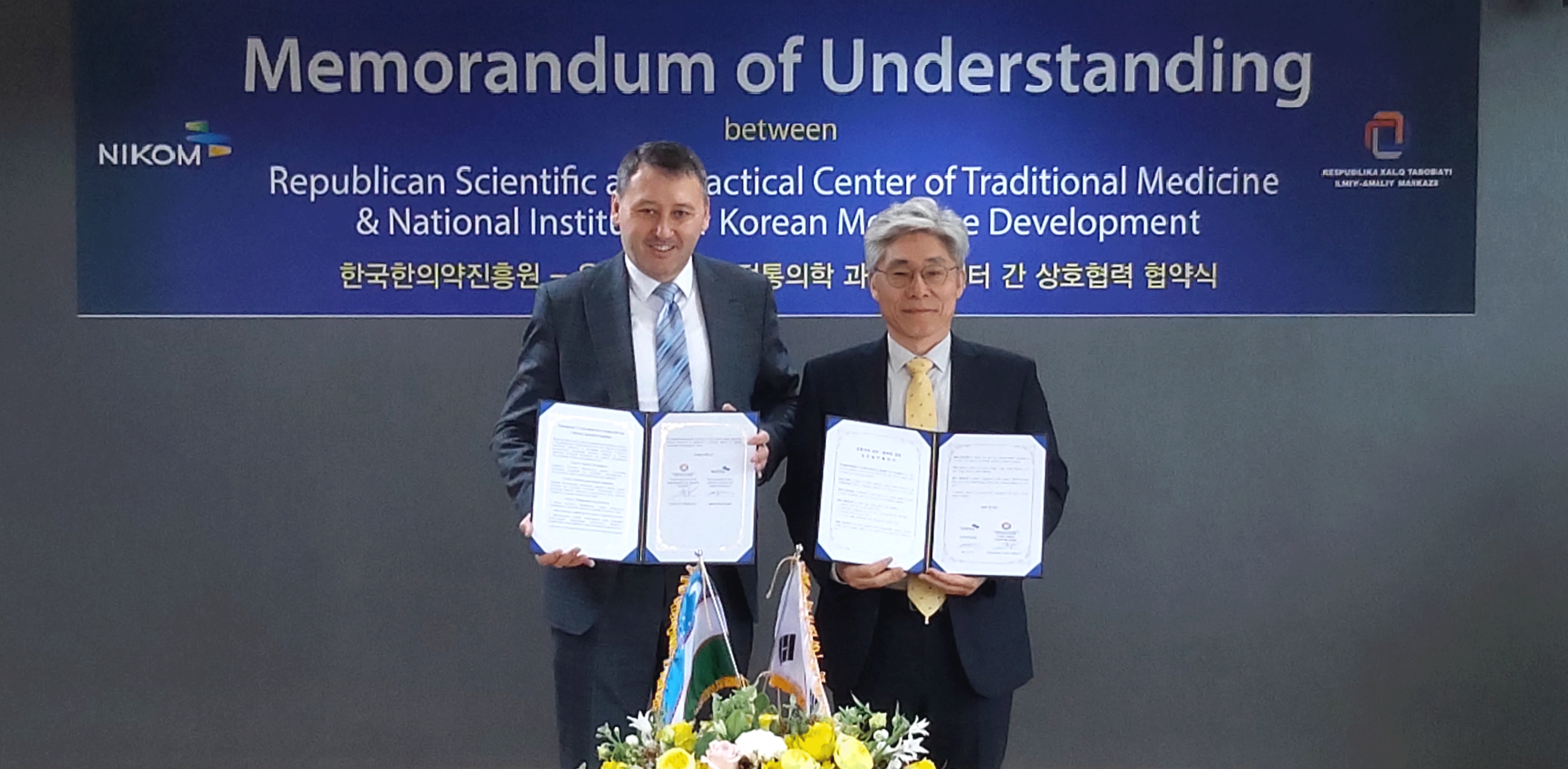 한국한의약진흥원(이하 NIKOM)은 3월 24일(금) 서울분원에서 우즈베키스탄 전통의학과학임상센터(Republic Scientific and Practical Center of Traditional Medicine)와 업무협약을 체결하였다. 이번 업무협약 체결은 양 기관이 전통의약의 발전을 위한 교류 및 공동협력체계 구축과 지속적 협력을 통한 상호 발전에 목적이 있다. 업무협약의 주요내용은 전통의약 분야 지식과 정보의 교류, 전통약재 산업화(재배·생산·가공·유통 등) 및 의료서비스 협력, 전통의약 전문가 교육 및 연수 등이다.