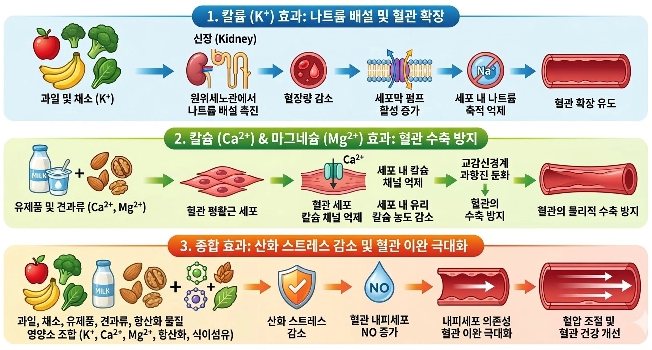 DASH 식단이 혈압 강하를 유도하는 핵심적인 병태생리학적 기전은 나트륨 제한에 따른 체액량 감소와 더불어 칼륨, 마그네슘, 칼슘의 흡수 증가가 혈관 내피세포 기능 및 평활근의 긴장도에 미치는 복합적인 생리 활성 변화로 설명됩니다.