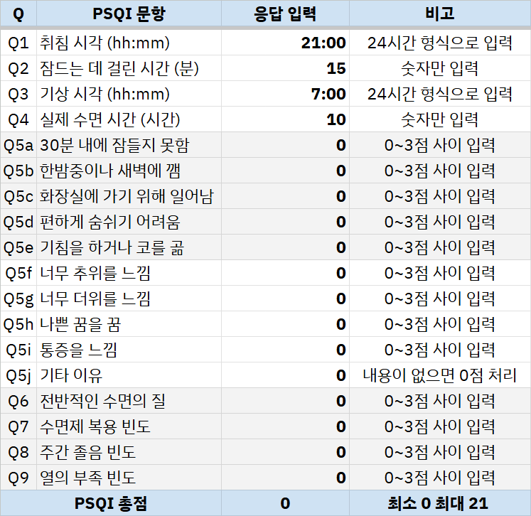 정확한 채점 방식은 원개발자인 피츠버그 대학교 수면의학센터에서 배포하는 공식 채점 매뉴얼 PDF 링크를 통해 확인하실 수 있습니다. 아울러 공식 채점 매뉴얼에 기반하여 제가 직접 제작한 PSQI 채점 계산기를 구글 시트로 제작하여 배포합니다. 아래 링크를 참조하여 실무에 적극 활용하시면 되겠습니다.